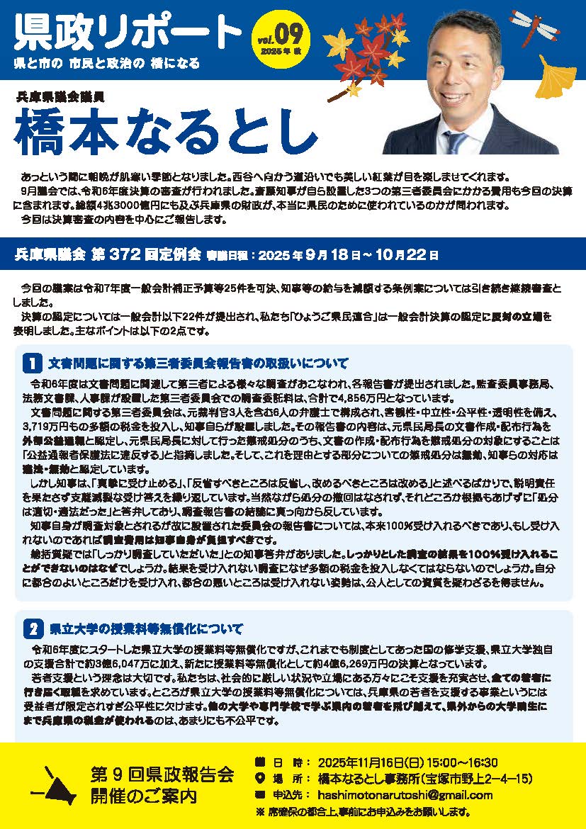 県政リポートvol.9 を発行しましたのでお知らせします。下記よりご高覧ください。